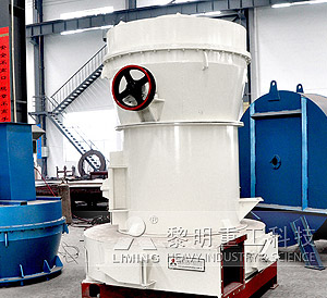 大塊狀物料經(jīng)顎式破碎機(jī)破碎到所需要粒度后,由提升機(jī)將物料送至儲(chǔ)料斗,再經(jīng)振動(dòng)給料機(jī)均勻定量連續(xù)地送入主機(jī)磨室內(nèi)進(jìn)行研磨。粉磨后的粉子被風(fēng)機(jī)氣流帶走,經(jīng)分析機(jī)分級(jí),符合細(xì)度的粉子隨氣流經(jīng)管道進(jìn)入大旋風(fēng)收集器內(nèi),進(jìn)行分離收集,再經(jīng)粉管排出成品粉子。