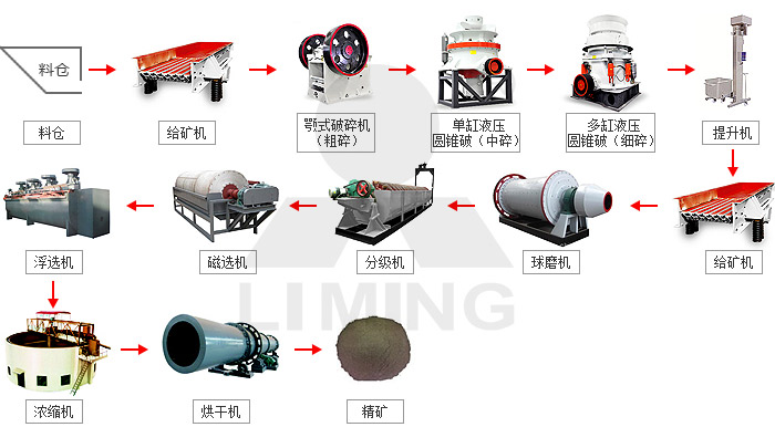 選礦生產(chǎn)線一般分為磁選法和浮選法兩種不同的選取作業(yè)方式,具體流程如下:給礦機(jī)將開采的礦石送入顎式破碎機(jī)進(jìn)行初步破碎,粗破后的礦石由圓錐破碎機(jī)破碎至合理細(xì)度后經(jīng)由提升機(jī)、給礦機(jī)均勻送入球磨機(jī)進(jìn)行粉碎、研磨。研磨出的礦石進(jìn)入分級(jí)機(jī)內(nèi),分級(jí)機(jī)借助固體顆粒比重不同在液體中沉淀速度不同的原理,對(duì)礦石混合物進(jìn)行洗凈、分級(jí)。經(jīng)過洗凈和分級(jí)的礦物混合料在經(jīng)過磁選機(jī)時(shí),由于各種礦物的比磁化系數(shù)不同,經(jīng)由磁力和機(jī)械力將混合料中的磁性物質(zhì)分離開來。經(jīng)過磁選機(jī)初步分離后的礦物顆粒再被送入浮選機(jī),根據(jù)不同的礦物特性加入不同的藥物,使得所要的礦物質(zhì)與其他物質(zhì)分離開。在所要的礦物質(zhì)被分離出來后,因其含有大量水分,須經(jīng)濃縮機(jī)的初步濃縮,再經(jīng)烘干機(jī)烘干,即可得到干燥的礦物質(zhì)。