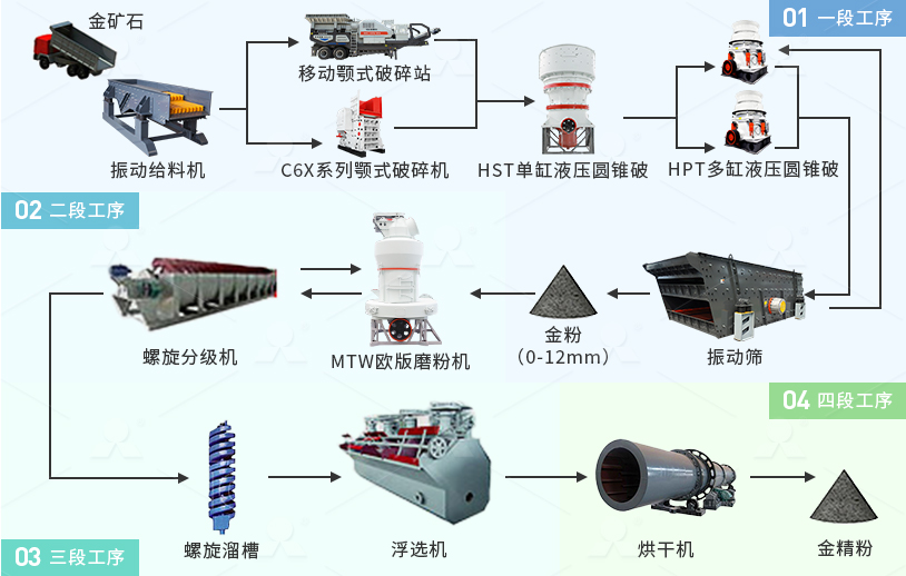 金礦石加工生產(chǎn)工藝主要包括:破碎、磨礦、選礦三個(gè)過程: