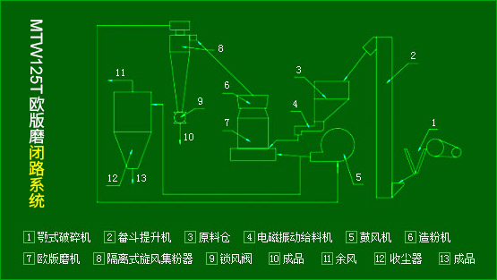 MTW215T歐版磨為立式結(jié)構(gòu),占地面積小,成套性強(qiáng)。主要由主機(jī)、風(fēng)機(jī)、選粉機(jī)、專(zhuān)用除塵器、旋風(fēng)集粉器、管道裝置和電機(jī)組成。配套輔助設(shè)備包括顎式破碎機(jī)、畚斗提升機(jī)、電磁振動(dòng)給料機(jī)、料倉(cāng)、配電柜等。 MTW215T歐版磨為碾壓成粉,是一個(gè)密閉的循環(huán)系統(tǒng),在負(fù)壓狀態(tài)下循環(huán)流動(dòng)。該設(shè)備主要部件均采用品質(zhì)良好鋼材制造,整機(jī)耐用可靠,自動(dòng)化程度高,是目前理想的粉磨設(shè)備。