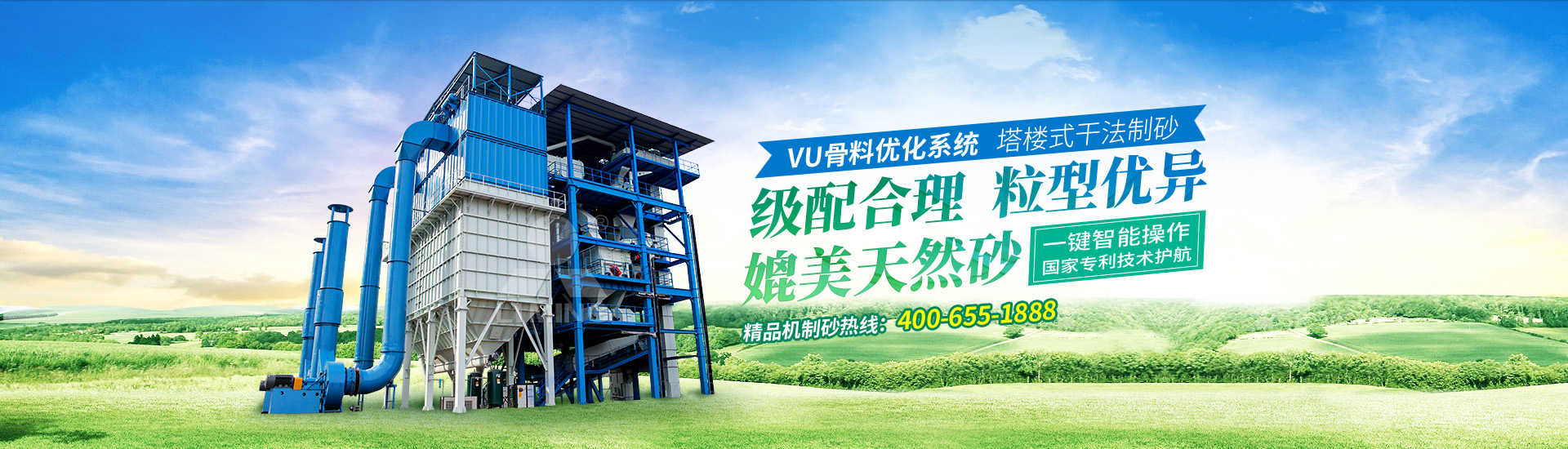 斗提機(jī)將原料輸送至頂樓,由輸送皮帶送入VU沖擊破,經(jīng)高頻石打石研磨后進(jìn)入??睾Y,分選后篩上料返回VU沖擊破再加工,篩下料進(jìn)入VU粒優(yōu)機(jī)整形成準(zhǔn)成品砂,同時(shí)通過(guò)脈沖式除塵器的風(fēng)選控制石粉量。最后準(zhǔn)成品砂通過(guò)加濕攪拌機(jī)均勻拌合后即為成品機(jī)制砂,石粉則被統(tǒng)一儲(chǔ)存在粉礦倉(cāng)中。