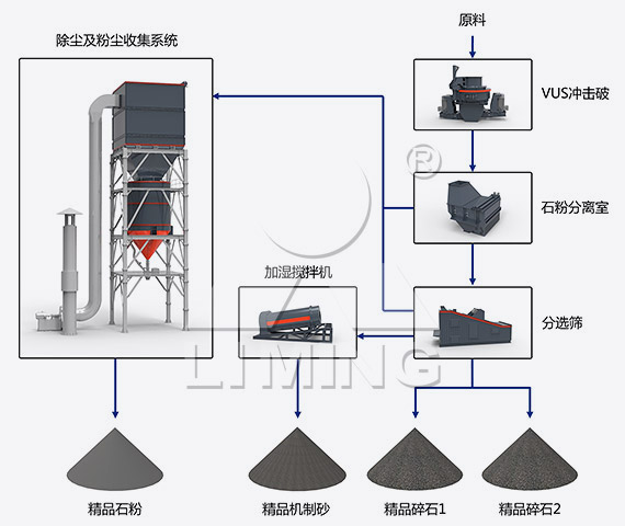 VUS砂石同出系統(tǒng)采用干法生產(chǎn)工藝,主要由上料輸送系統(tǒng)、制砂整形篩分系統(tǒng)、除塵系統(tǒng)、石粉存儲系統(tǒng)和電氣控制系統(tǒng)組成。