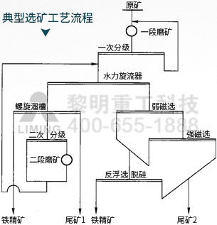 赤鐵礦選礦技術 赤鐵礦典型的選礦工藝流程有三種:連續(xù)磨礦―弱磁―強磁―陰離子反浮選、階段磨礦―粗細分選―重―磁―陰離子反浮選和階段磨礦―粗細分選―磁―重―陰離子反浮選。