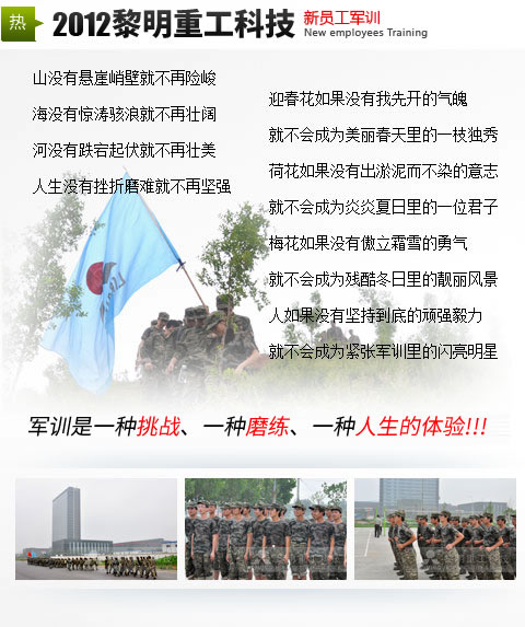 黎明重工科技自2004年啟動大學(xué)生員工計(jì)劃以來,軍訓(xùn)拓訓(xùn)已成為每一位新員工入職的必經(jīng)之路。百余位職場新人朝夕相對,統(tǒng)一的作息時(shí)間,近似嚴(yán)苛的軍訓(xùn)項(xiàng)目,蘊(yùn)藏深意的拓訓(xùn)內(nèi)容。流火的七月,肆意揮灑的汗水,熱情洋溢的青春,2012屆新進(jìn)職員,即將在這里開啟人生新的篇章。