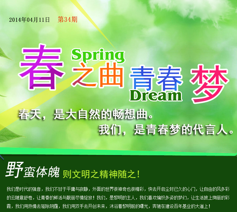 我們是時代的強音,我們不甘于平庸與寂靜,外面的世界很神奇也很精彩,快去開啟塵封已久的心門,讓自由的風多彩的云隨意舒卷,讓青春的鮮活與靚麗盡情綻放!我們,是黎明的主人,我們喜歡編織多姿的夢幻,讓生活披上絢麗的彩霞,我們用熱情去驅除陰霾,我們用雙手去開創(chuàng)未來,沐浴著黎明前的曙光,奔馳在建設百年基業(yè)的大道上!