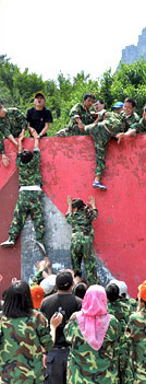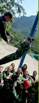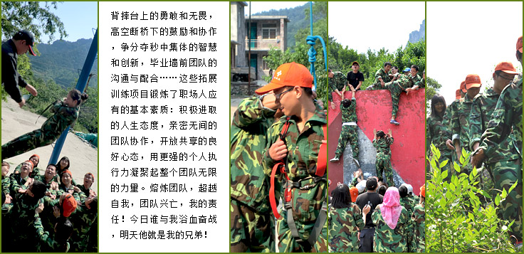 背摔臺上的勇敢和無畏,高空斷橋下的鼓勵和協(xié)作,爭分奪秒中集體的智慧和創(chuàng)新,畢業(yè)墻前團隊的溝通與配合……這些拓展訓練項目鍛煉了職場人應有的基本素質(zhì):積極進取的人生態(tài)度,親密無間的團隊協(xié)作,開放共享的良好心態(tài),用更強的個人執(zhí)行力凝聚起整個團隊無限的力量。熔煉團隊,超越自我,團隊興亡,我的責任!今日誰與我浴血奮戰(zhàn),明天他就是我的兄弟!