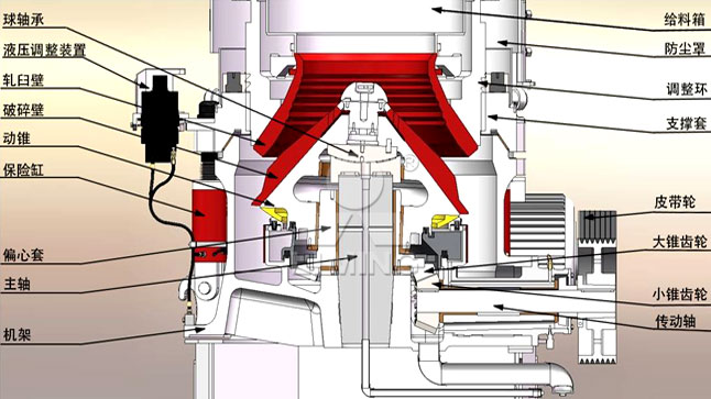 HPT液壓圓錐破碎機(jī)主要由機(jī)架部、支撐套部、調(diào)整環(huán)部、動(dòng)錐部、偏心套部、傳動(dòng)部和保險(xiǎn)裝置部七大部件組成,主軸固定,電動(dòng)機(jī)帶動(dòng)傳動(dòng)軸旋轉(zhuǎn),傳動(dòng)軸通過(guò)齒輪帶動(dòng)偏心套繞主軸旋轉(zhuǎn),再由偏心套帶動(dòng)動(dòng)錐部做偏心圓周擺動(dòng),從而實(shí)現(xiàn)連續(xù)的擠壓破碎石塊。